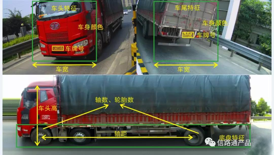 2)?車型識別:精準識別車型,區(qū)分客車、貨車、分別根據軸數(shù),長度,定義車輛類型.
